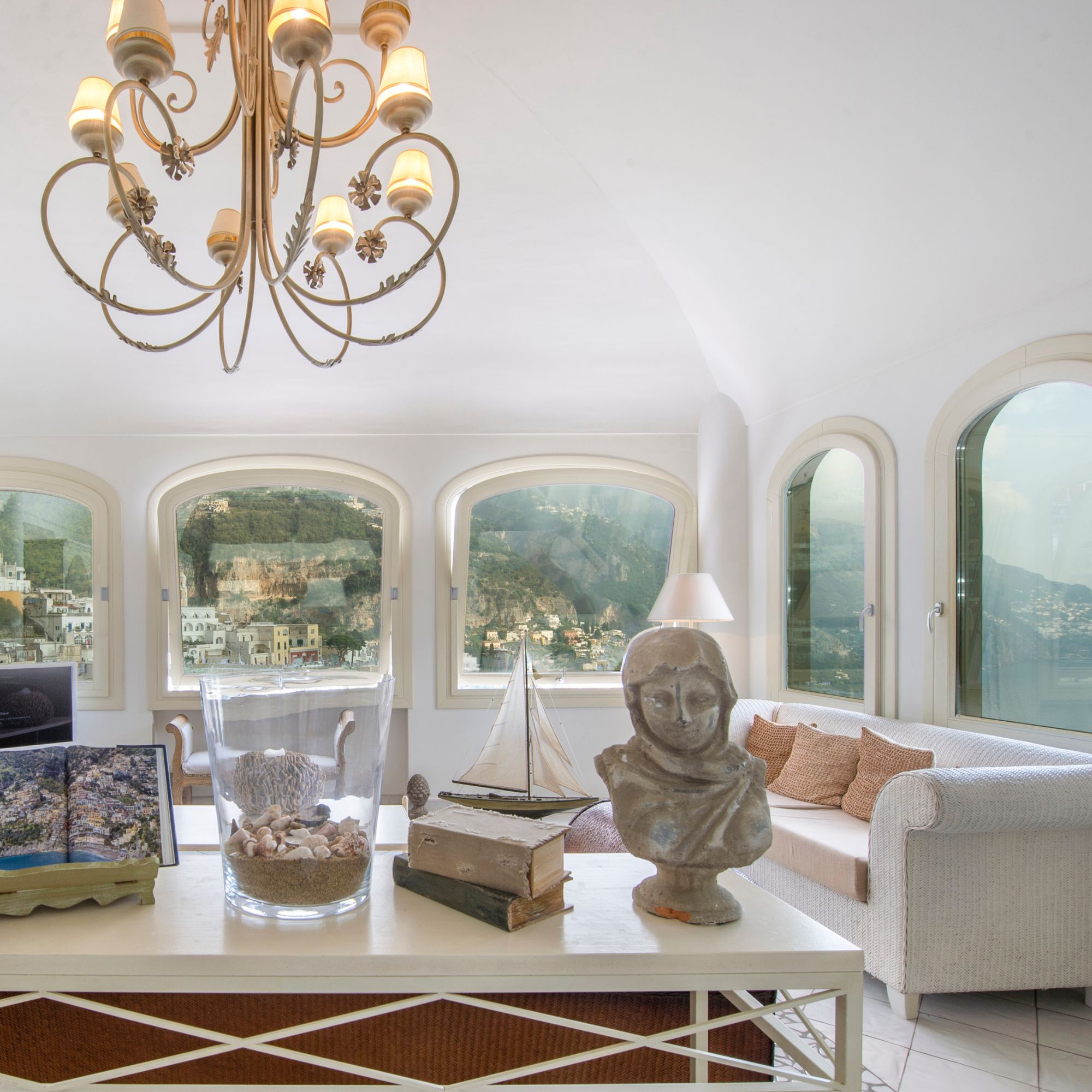 L’ingresso principale si apre su un soggiorno climatizzato, caratterizzato da ampie vetrate panoramiche a 180 gradi che regalano viste spettacolari su Positano e il suo golfo. Dal soggiorno, cinque gradini conducono a un corridoio. Sulla destra si trova la prima camera da letto, climatizzata e arredata con un elegante letto matrimoniale a baldacchino, completa di bagno privato e una terrazza esclusiva con vasca idromassaggio affacciata su Positano. Più avanti lungo il corridoio si accede alla seconda camera da letto, anch’essa climatizzata e configurabile come matrimoniale o doppia, dotata di bagno privato. Per accedere a questa stanza è necessario scendere sei gradini. Vicino al corridoio si trova una sala massaggi e l’ascensore interno è comodamente situato nelle vicinanze. Tutte le camere della villa dispongono di doccia a pioggia e TV a schermo piatto per un soggiorno confortevole.