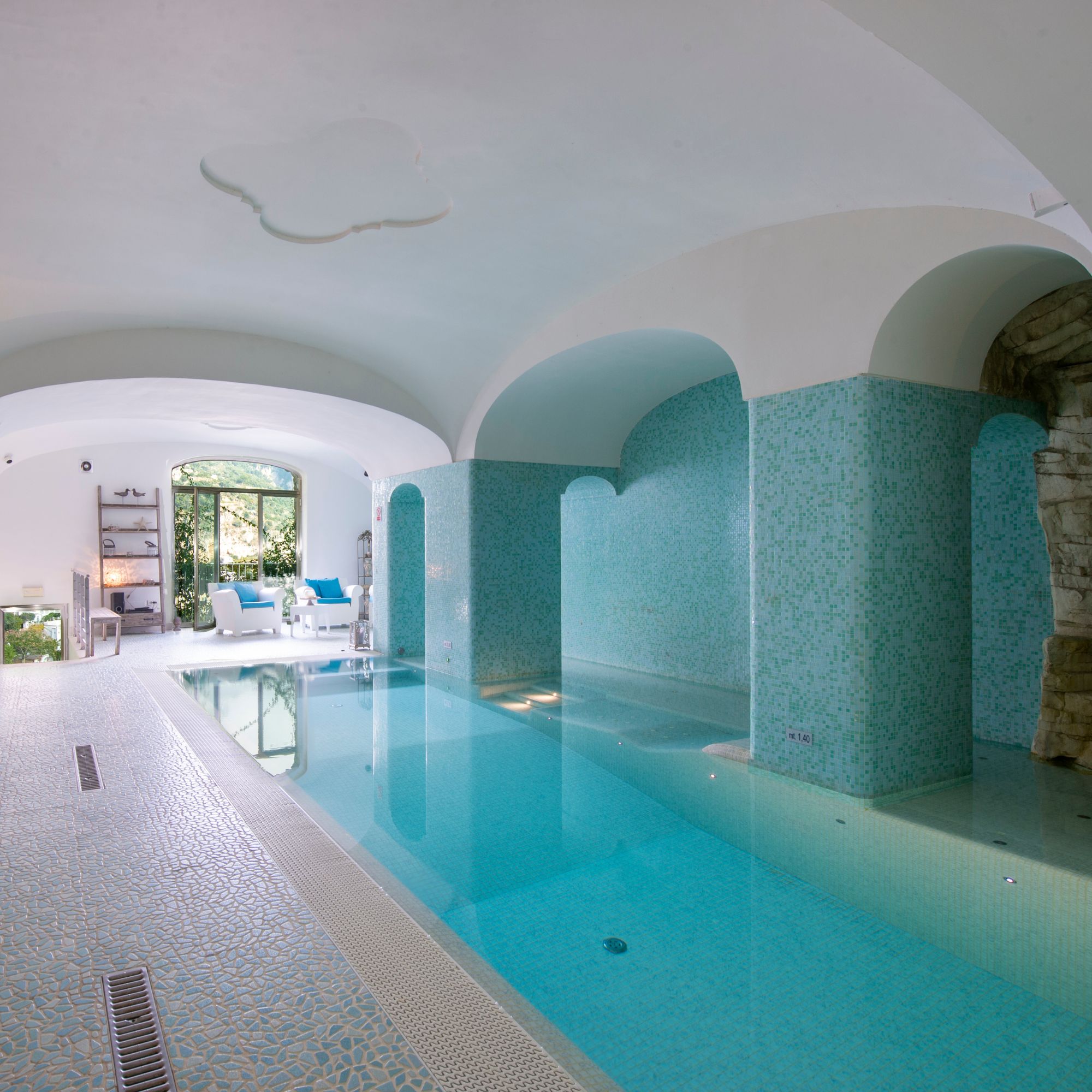 Una scala di 21 gradini, o l’ascensore, porta al piano seminterrato, un’area interamente dedicata al relax e al benessere. Qui si trova una zona wellness all’avanguardia con una piscina privata riscaldata di 10 x 5 metri, un bagno turco e una zona lounge pensata per il massimo comfort. Un piccolo bagno serve quest’area. La sesta e ultima camera da letto si trova in questo piano, raggiungibile con quattro gradini. La stanza, climatizzata, può essere configurata come matrimoniale o doppia ed è dotata di bagno privato e patio esterno.